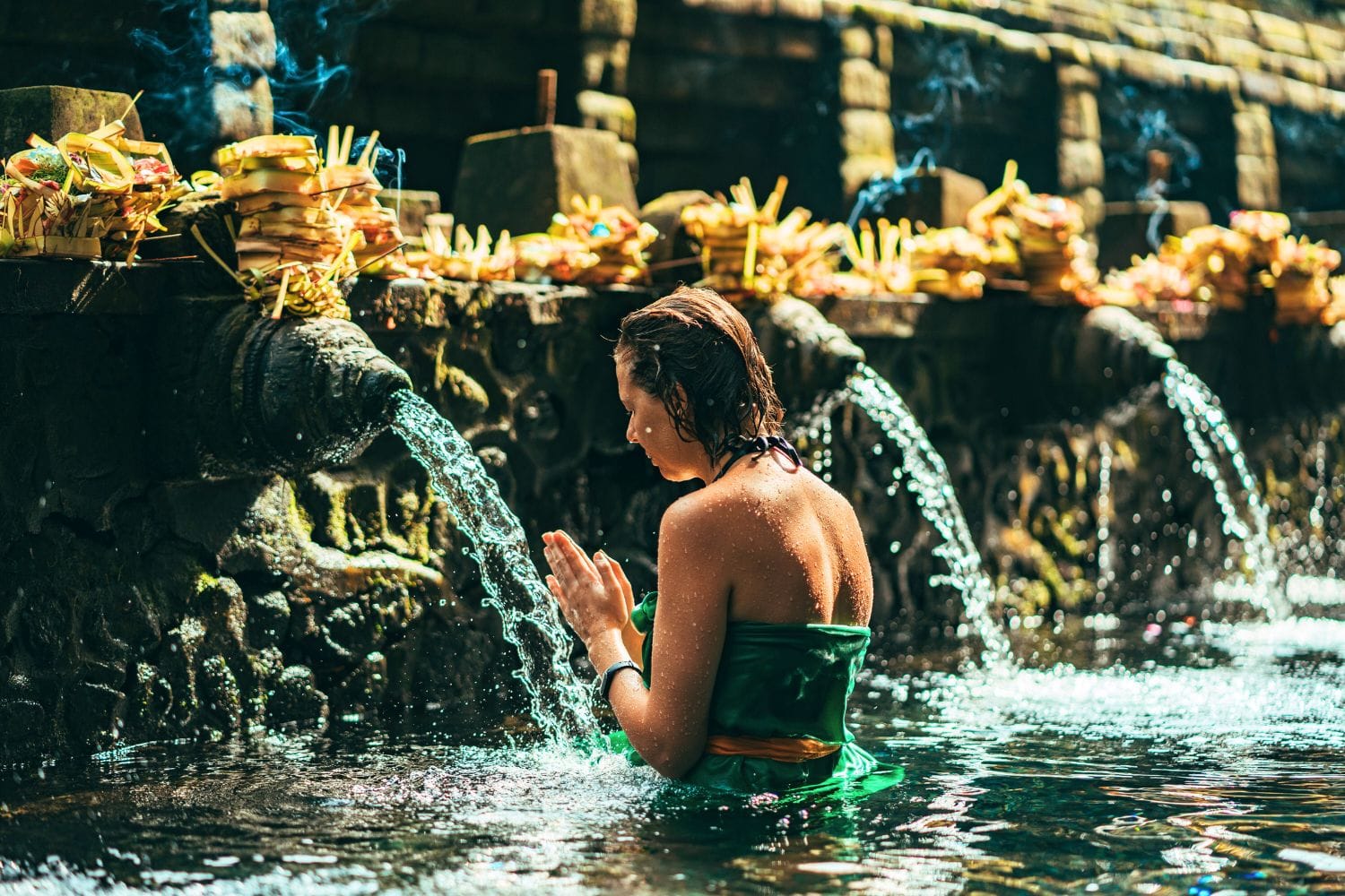 Start your trip at Tirta Empul Temple, one of Bali's most important holy-water temples. Take a stroll through the peaceful courtyard and discover its spiritual significance in Balinese Hindu tradition. If you'd like, you can take part in the **melukat** purification ritual. This is an authentic local experience where visitors cleanse in the temple's spring-fed pools for renewal and positive energy.
